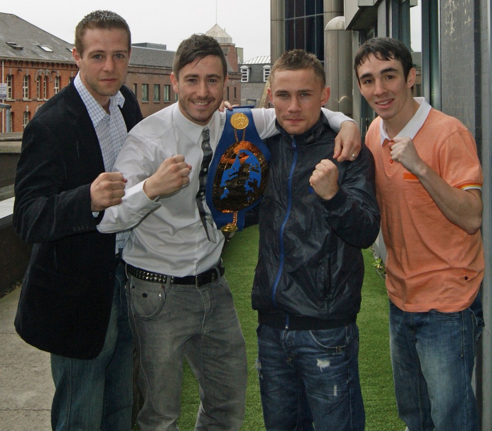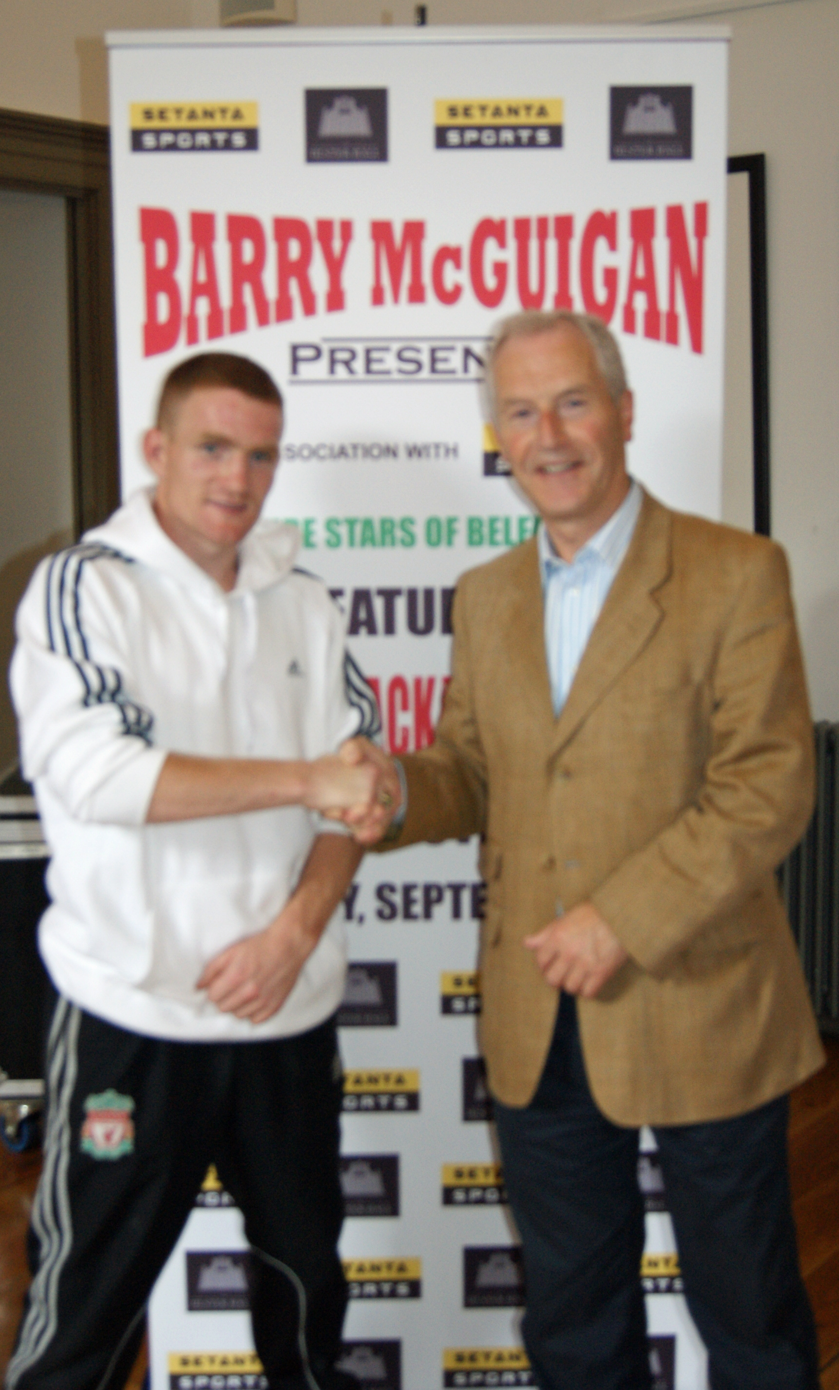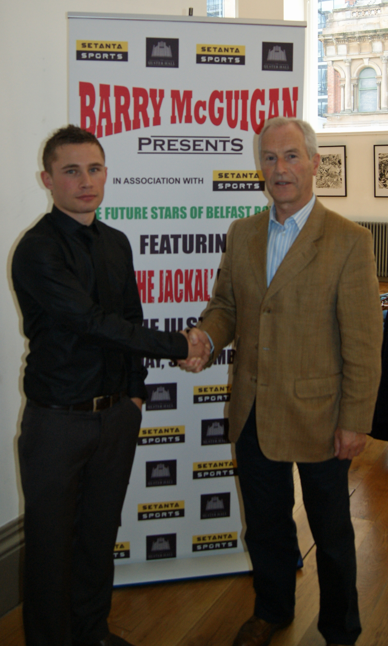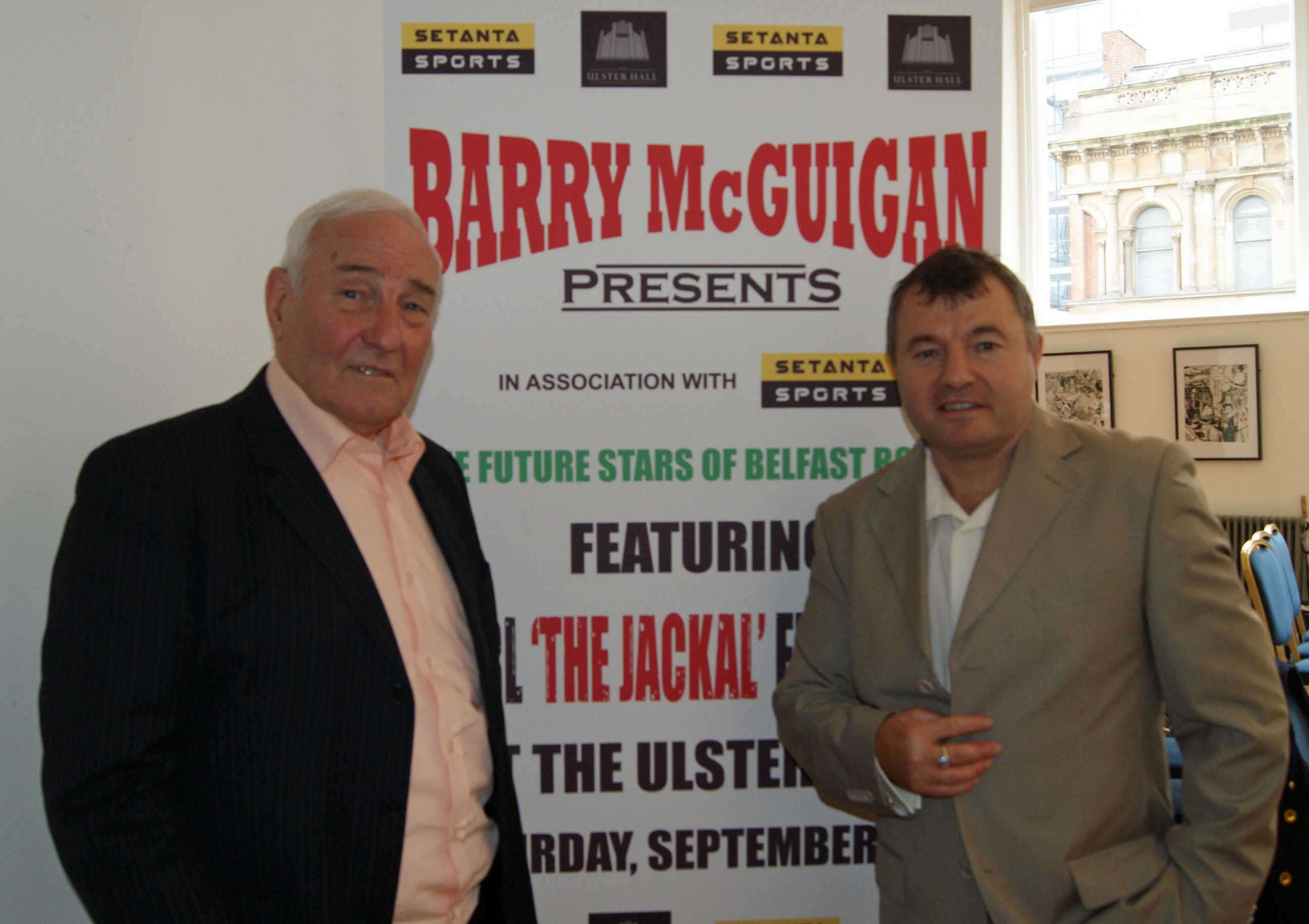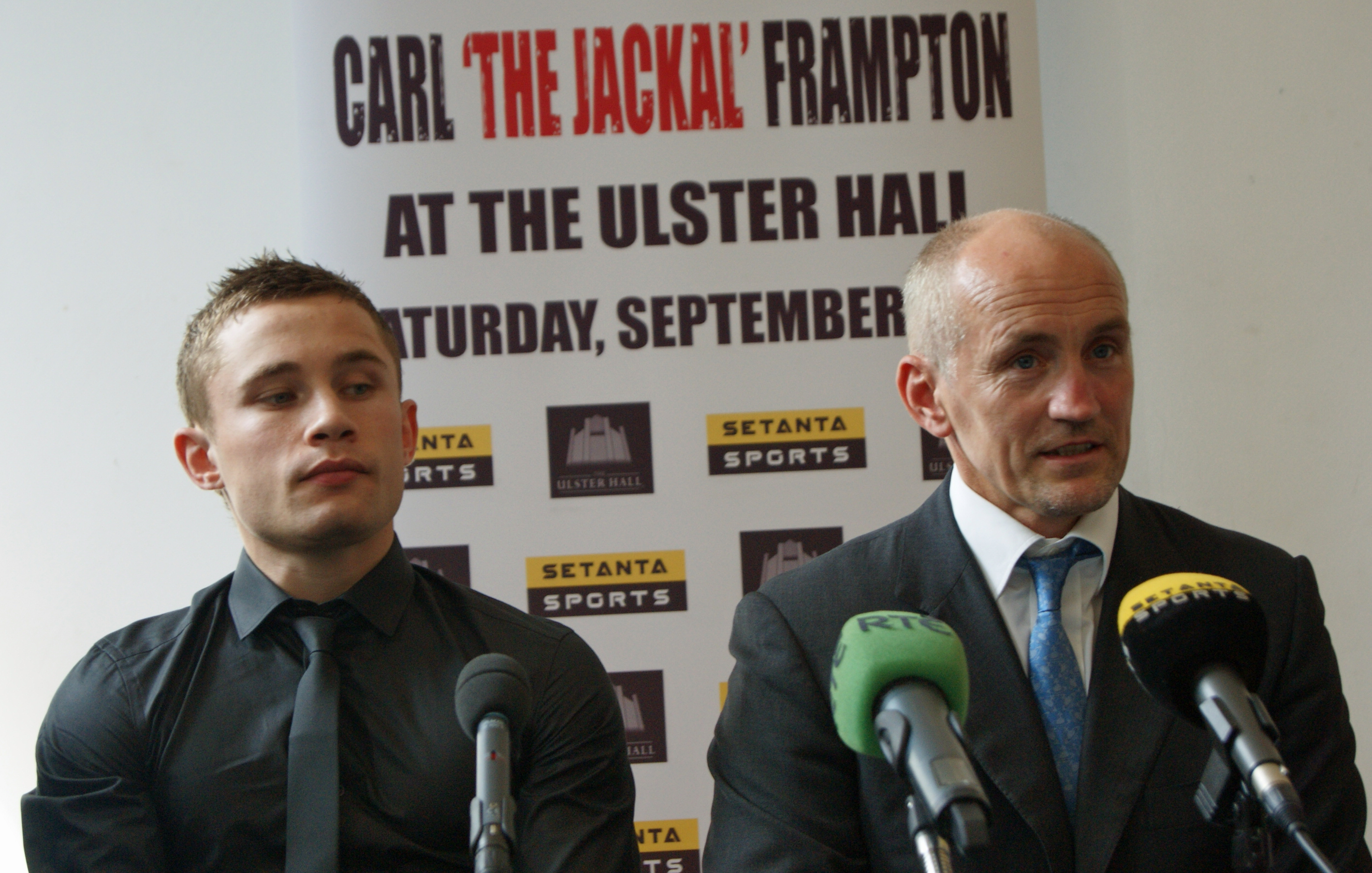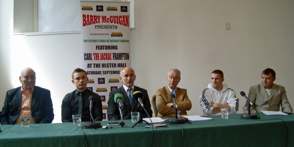 The fourth set are from the Ulster Hall where promoter Barry McGuigan was busy announcing a six-fight deal with Setanta Sports in the Ulster Hall. Frampton only fought there twice as it happened, beating Yuri Voronin and Gavin Reid. Limerick’s Willie Casey was being lined up as a future opponent but to date the fight never materialised. Casey, his trainer Phil Sutcliffe Senior are in the photos along with Gerry Storey and Fergus Lavery a businessman who was heavily involved with ‘Team Jackal’ at the time.